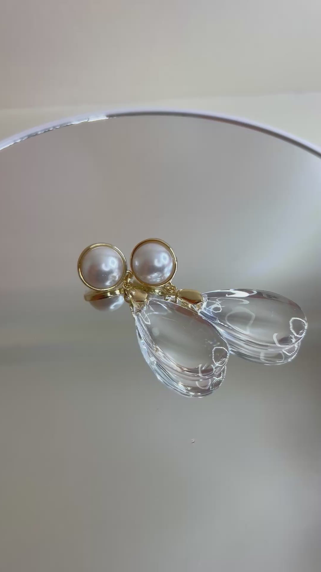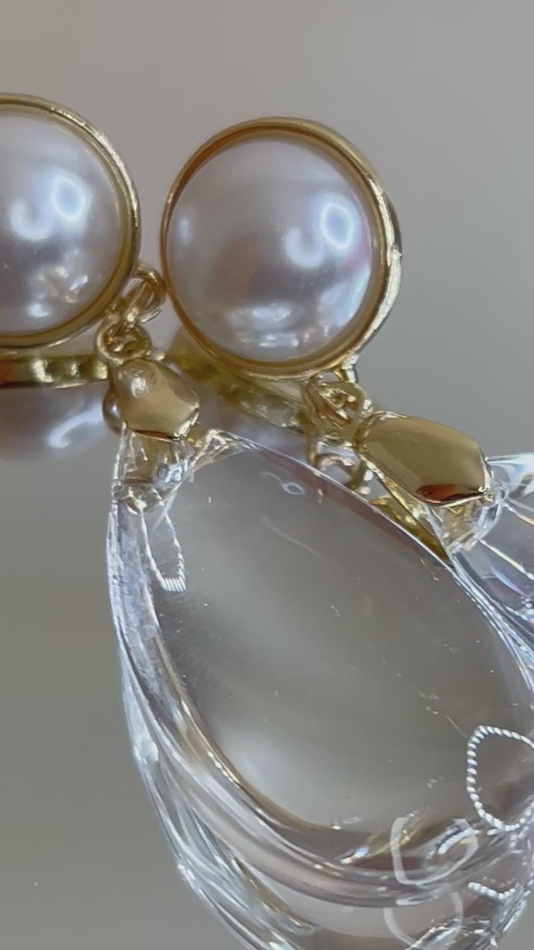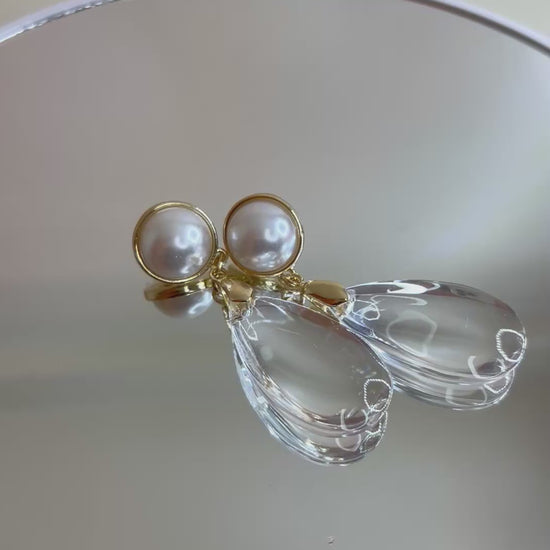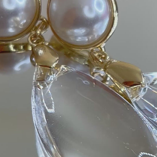 White faux pearl, transparent acrylic, teardrop long. Earring in gold tone.